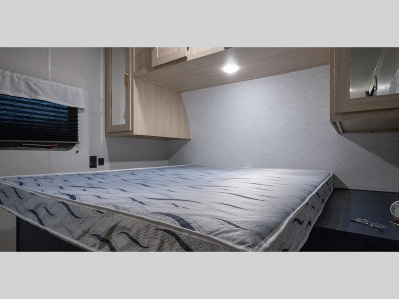 Each model is constructed with a fully enclosed underbelly, a PVC roof membrane, and gold reflective exterior windows that are sure to be eye-catching. The power tongue jack and power stabilizer jacks will have you set up in no-time, and the best-in-class drop frame pass-through storage means you can bring along extra camp gear. Inside, you'll find Congoleum flooring, seamless pressed countertops, a designer bedding package, and many more comforts.