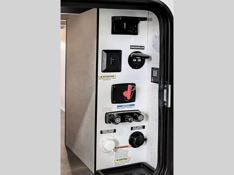 You can make yourself at home with solid pressed membrane countertops, 4k interior LED lights, and black roller shades for added privacy. The outside shower with hot and cold water will let you easily wash off camp gear, and the marine grade exterior speakers will allow you to be the life of the campground. You will also appreciate the universal docking station for easy access to your hookups, plus a high-output on-demand tankless water heater for hot water when you need it.