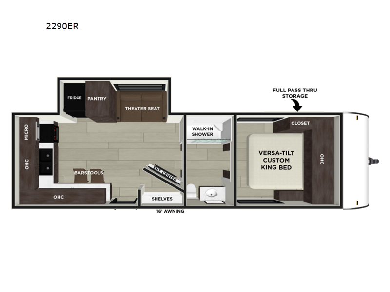 You'll love the amount of counter space you have in this rear kitchen travel trailer! You can whip up your best meals, then enjoy them at the counter with barstools. After dinner, you might want to relax on the theater seat within the large slide, or head outdoors to sit under the 16' patio awning. There is a swiveling entertainment center with shelves behind it where you can keep books, games, or snacks stocked! The walk-thru bath leads you to the front master bedroom where you can get the best night of sleep on the Versa-Tilt custom king bed!