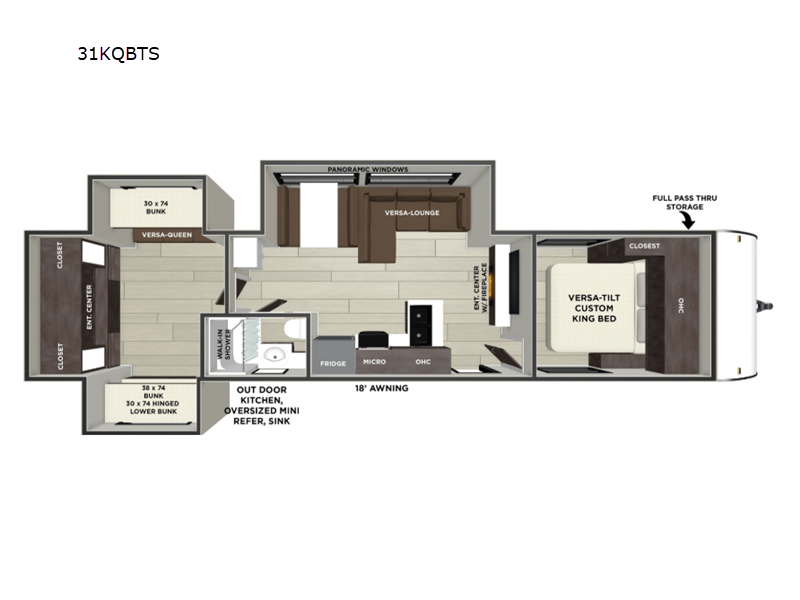 With this triple-slide travel trailer, everyone can have their own space! The private bunkhouse features dual opposing slides that provide tons of space for the kids to play. The large slide in the living area opens up the whole space, and here you'll find a Versa-Lounge and a booth dinette which is perfect for mealtimes and relaxing. You'll love the front private bedroom with a custom king bed with Versa-Tilt, and everyone will appreciate the full bath with a walk-in shower. The chef of the family can cook a meal on the cooktop, or you can prepare hamburgers at the outside kitchen that you are sure to love!